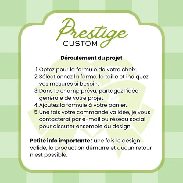 - Une fois votre commande validée, je vous contacterai par e-mail ou réseau social pour discuter ensemble du design.