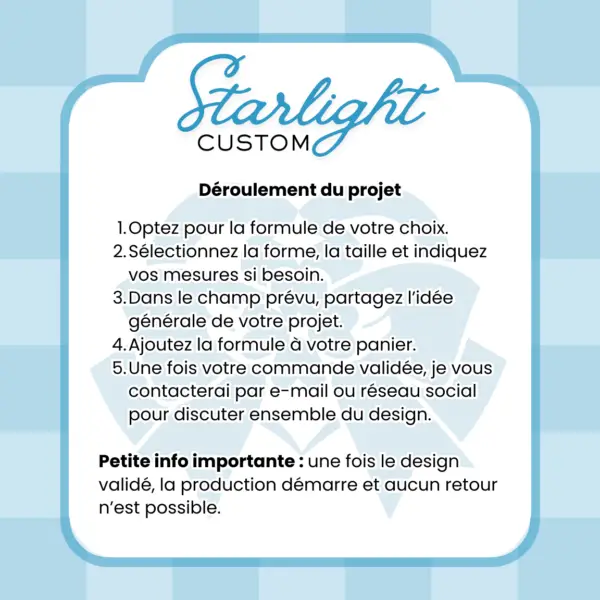 - Une fois votre commande validée, je vous contacterai par e-mail ou réseau social pour discuter ensemble du design.