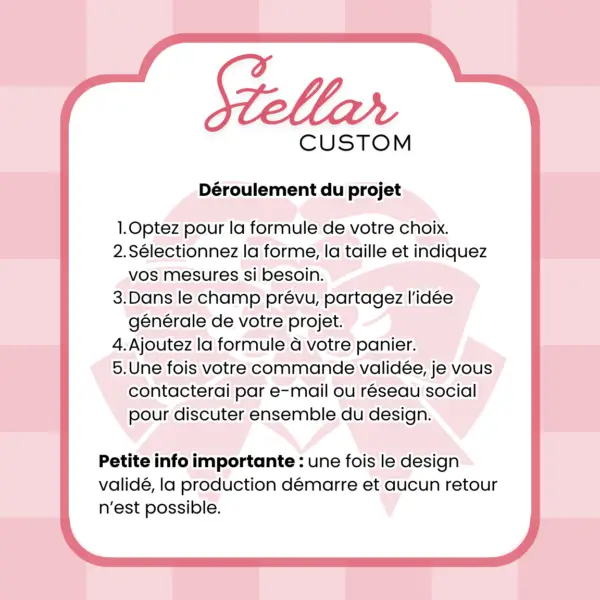 • Une fois votre commande validée, je vous contacterai par e-mail ou réseau social pour discuter ensemble du design.
